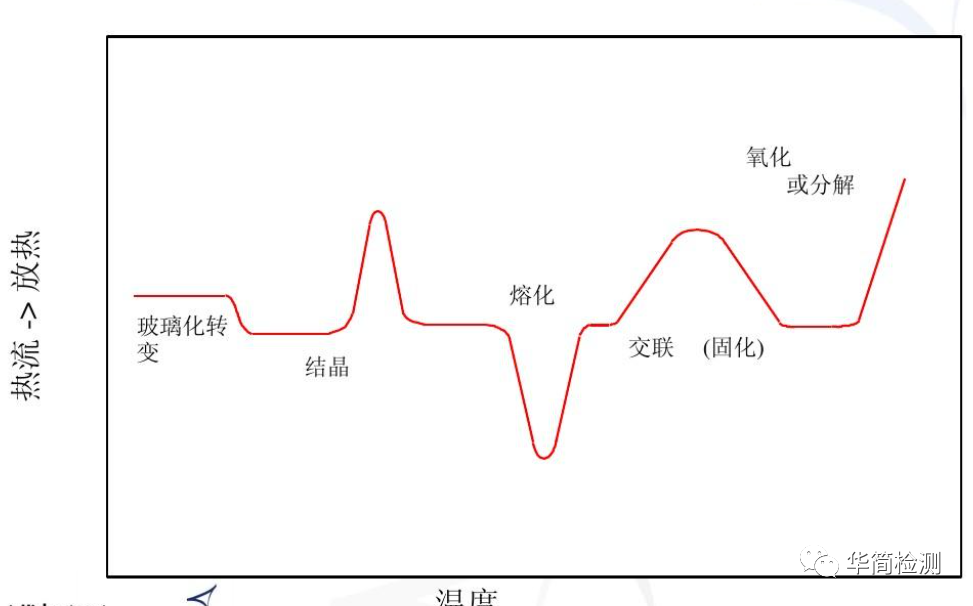 如下图所示,在典型DSC曲线上我们分别能够了解到材料的玻璃化转变温度、结晶温度、熔点、氧化(固化)温度、分解温度等。同时对于结晶,熔化,氧化等我们还能根据面积得分求得各自的焓变值。