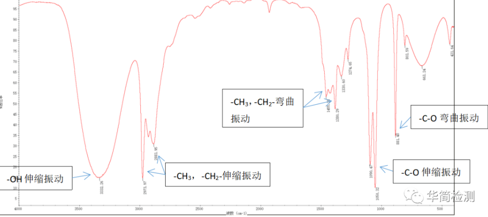如上图所示,添加了一个-OH基团之后,等于多增加了O-H键的振动峰,C-O键的振动峰。其中3332附近一个巨大的包峰,这个就是-OH特有的特征峰,峰形奇特出峰位置也比较特殊,基本都用于辨认-OH的存在。1050-1100附近的出峰一般为C-O单键的出峰,这个也是一个特征峰,但是由于含有C-O键的物质较多,一般只能确认一个大类的类型无法像-OH键的3300左右的峰那么特征。